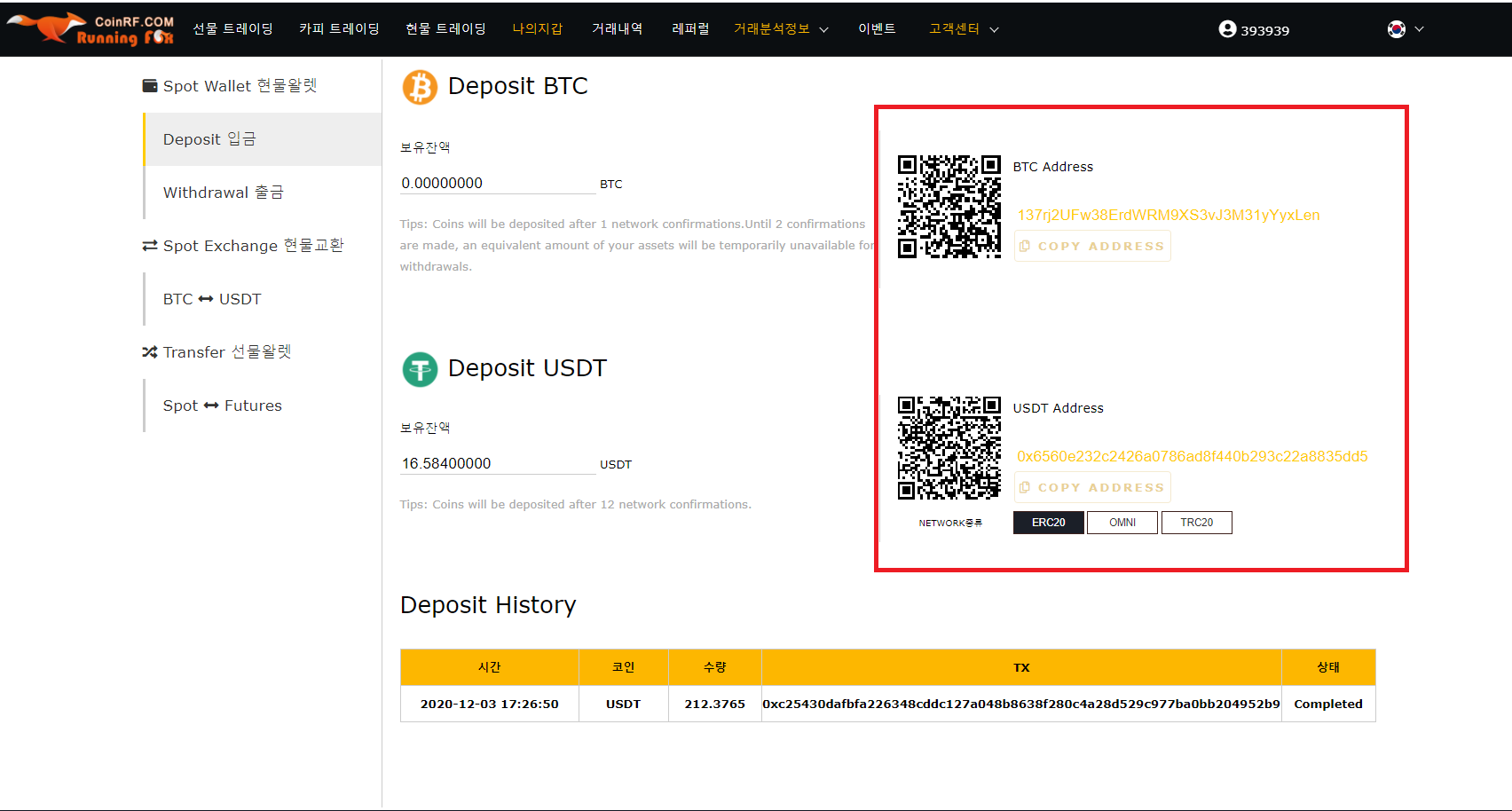 러닝폭스 거래소에서는 비트코인과 테더코인을 입금하실 수 있습니다.